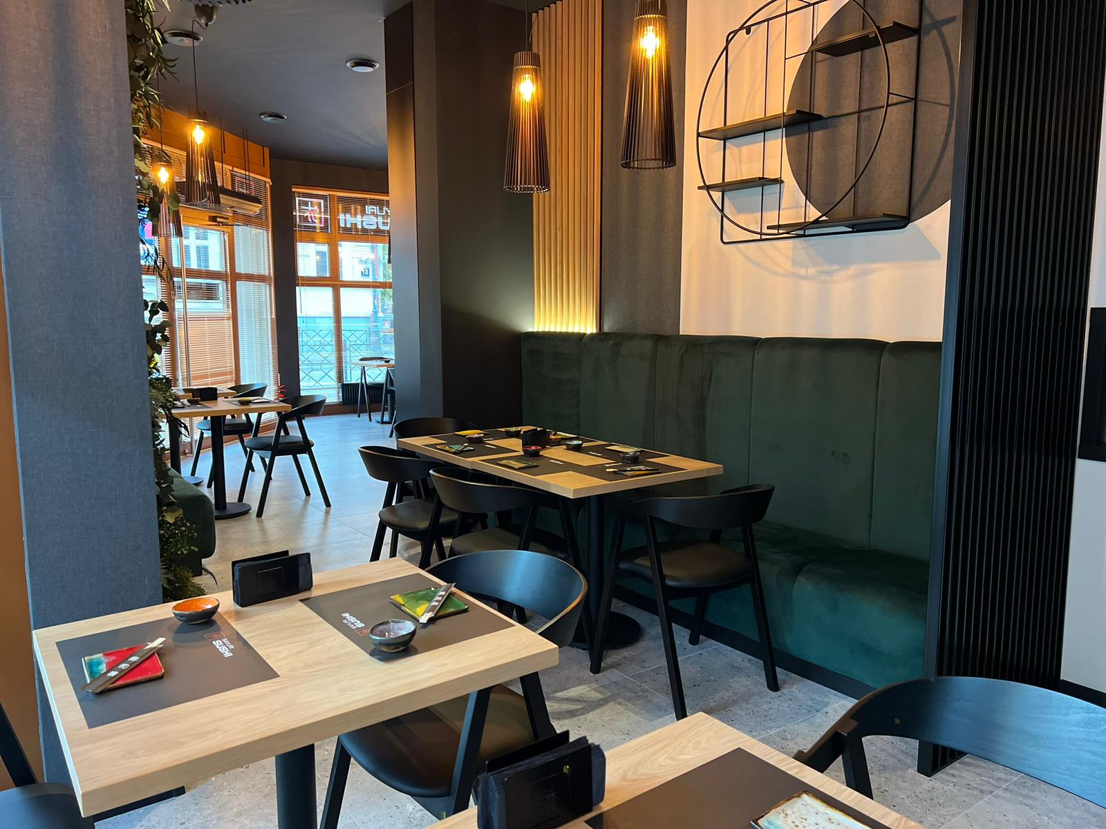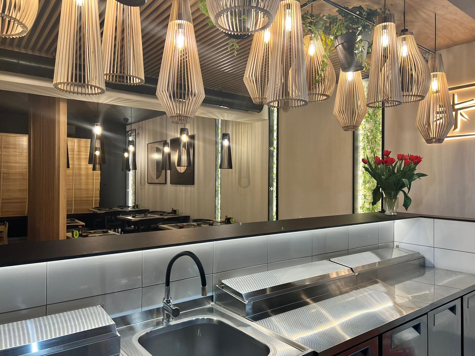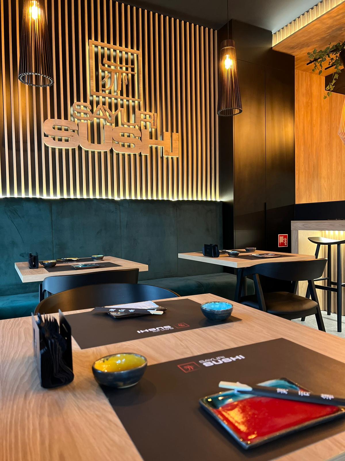 Kompleksowe wykonanie mebli i elementów dekoracyjnych dla dwóch restauracji znanej sieci Sayuri Sushi w Suwałkach i Ełku. Jako że jest to lokal gastronomiczny, materiały wykorzystane przy realizacji musiały być stylowe i trwałe jednocześnie. Niepowtarzalnego charakteru wnętrz w restauracjach Sayuri dodają stylowe lamele na ścianach i ściankach blatów oraz punktowe podświetlenia wewnętrzne (LED).