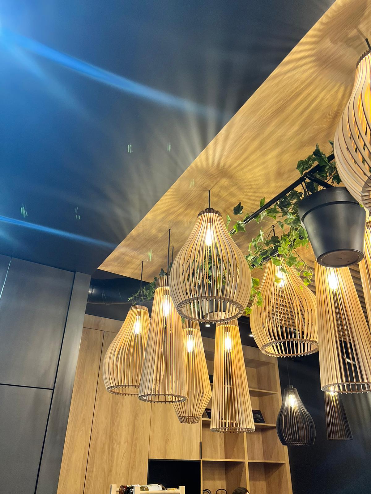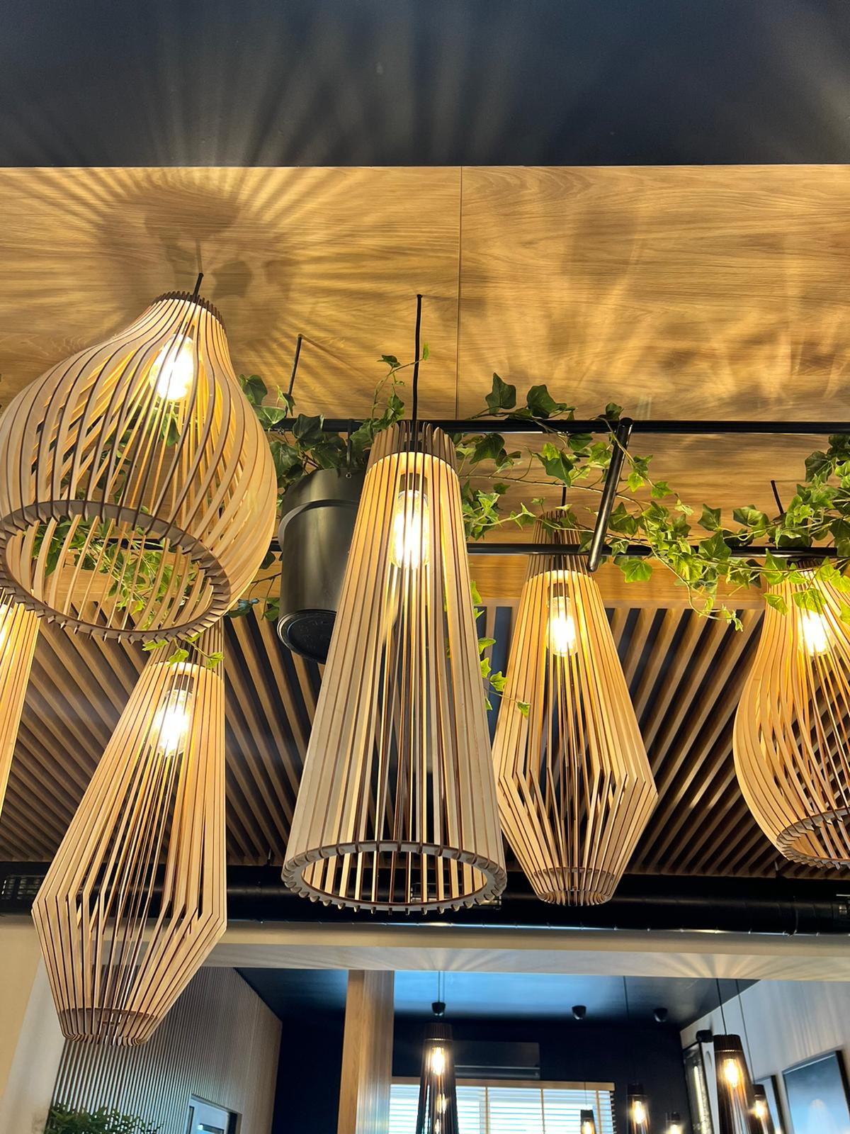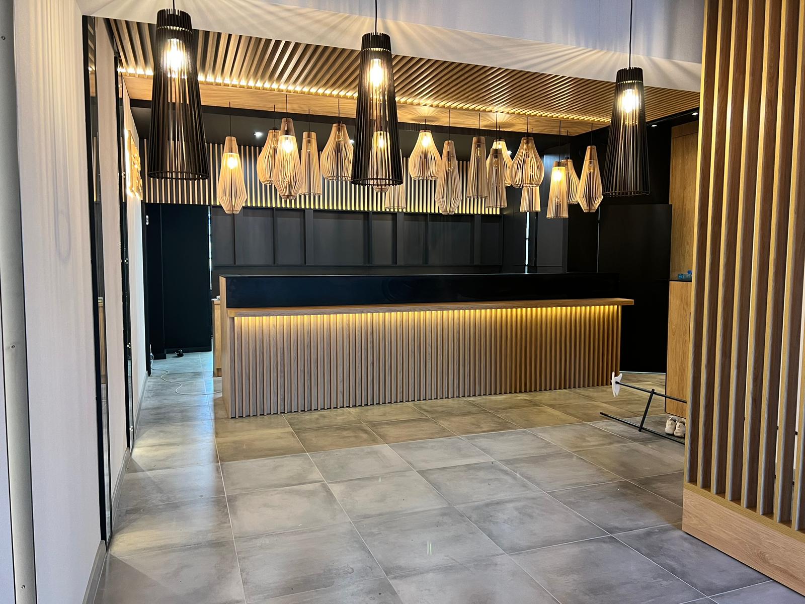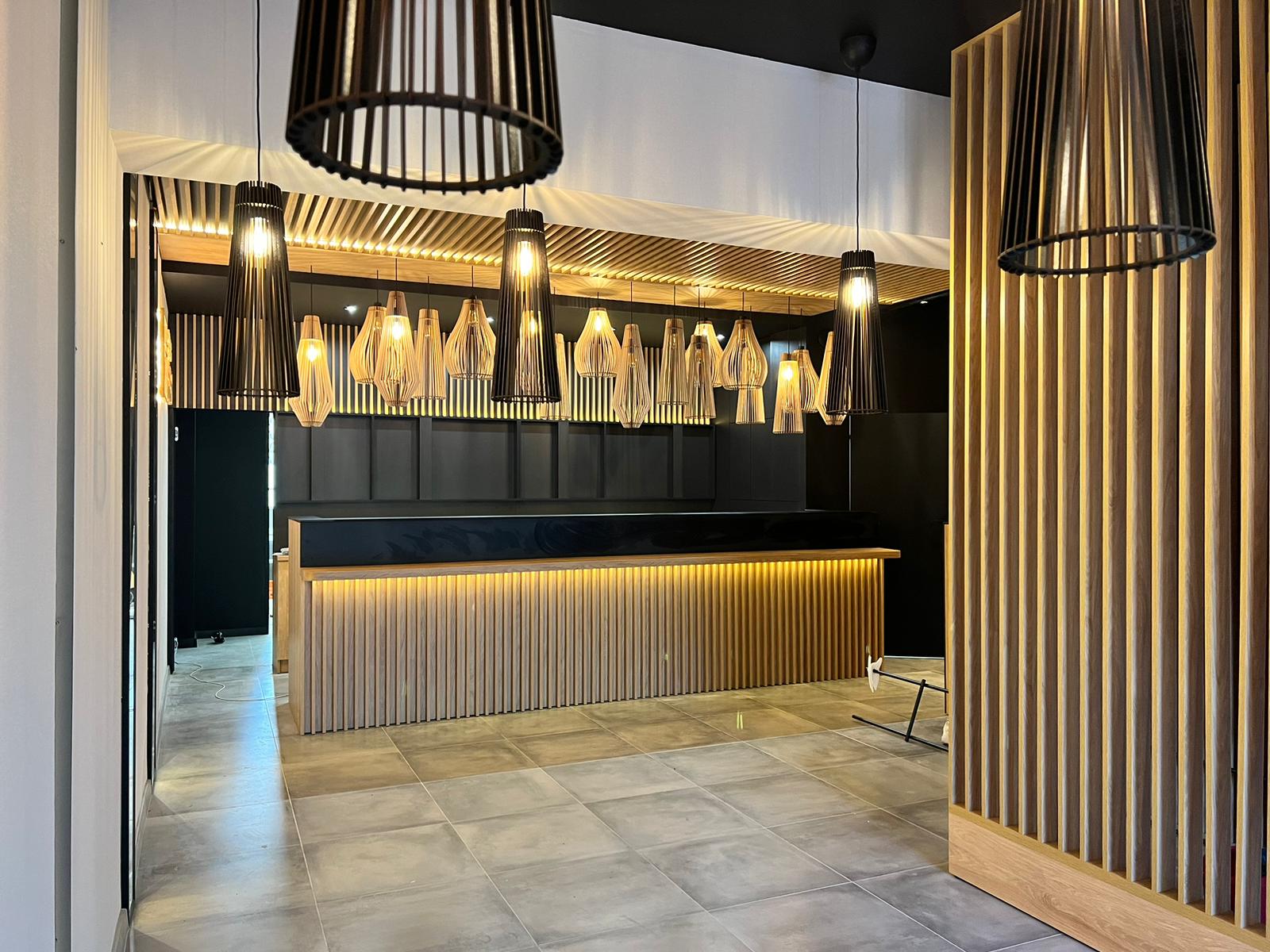 Kompleksowe wykonanie mebli i elementów dekoracyjnych dla dwóch restauracji znanej sieci Sayuri Sushi w Suwałkach i Ełku. Jako że jest to lokal gastronomiczny, materiały wykorzystane przy realizacji musiały być stylowe i trwałe jednocześnie. Niepowtarzalnego charakteru wnętrz w restauracjach Sayuri dodają stylowe lamele na ścianach i ściankach blatów oraz punktowe podświetlenia wewnętrzne (LED).